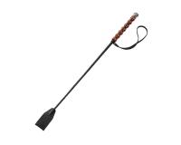Красивая волнообразная деревянная рукоять, с приятной глянцевой поверхностью, является главной особенностью аксессуара. Гибкий стержень стека обвит натуральной кожей чёрного цвета, что придаёт ему лаконичный, но роскошный вид. На кончике хлыста располагается прямоугольный шлепок из натуральной кожи. Также, около рукояти находиться петля, в виде тонкого кожаного плоского ремешка. Общая длина изделия составляет 60 см