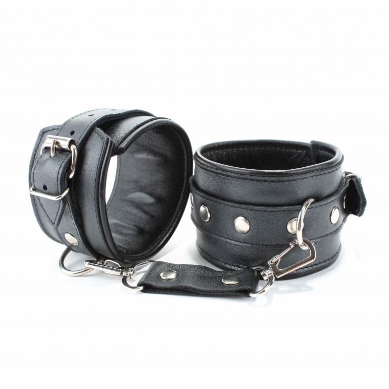 Наручники выполнены из гладкой черной натуральной кожи. Изделие декорировано металлическими заклёпками. Наручники надежно фиксируются пряжками и ремнями, позволяющими выбрать нужный размер,подойдут на обхват руки от 15 до 25см.Кожаное соединение на карабинах фиксирует наручники вместе, общая длина соединения 14см.Ширина наручников 6см, ширина ремешков 2см. На каждом аксессуаре полукольцо из сварной фурнитуры. Стильные наручники помогут воплотить эротические фантазии в реальность.